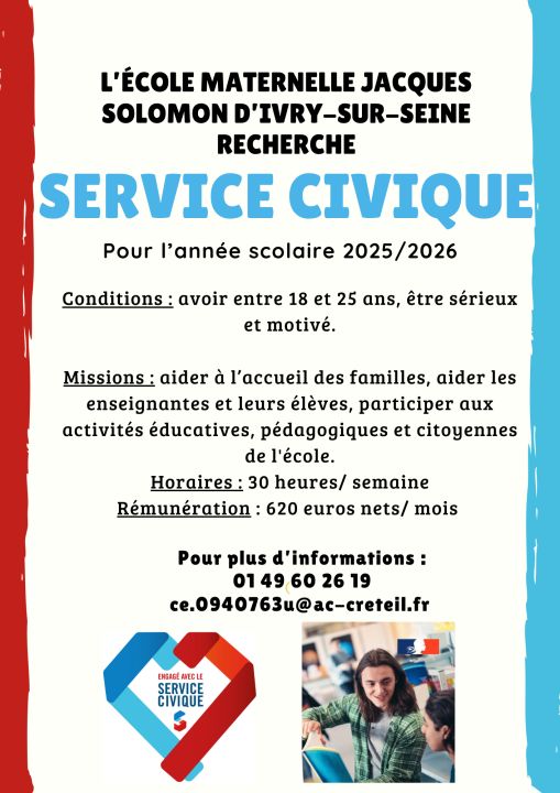 Notre école recherche un(e) jeune pour une mission de service civique pour compléter notre équipe. Peut-être connaissez-vous un(e) jeune (18-25 ans) intéressé(e) ? N'hésitez pas à en parler autour de vous!